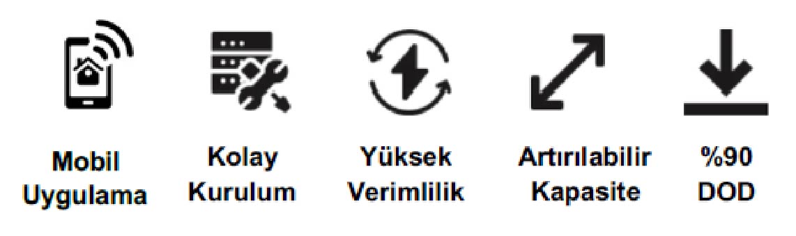 • Maksimum 190A şarj/deşarj akımı • Akü şarj/deşarj için 6 zaman periyodu • Dizel jeneratör ile entegre çalışma, jeneratörden enerji depolama desteği • Ekstra uzun ömür, 8000 döngü • Uzaktan bağlantı ve kurulum desteği • Mobil uygulama ile uzaktan takip ve kontrol